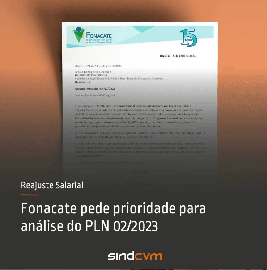Diante disso, Fórum Nacional Permanente de Carreiras Típicas de Estado (Fonacate), do qual o SindCVM é membro, enviou ofício a Pacheco para destacar a importância da apreciação célere do dispositivo.