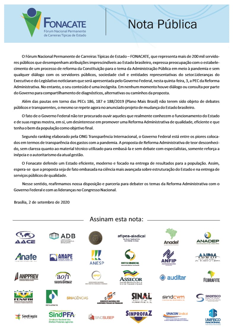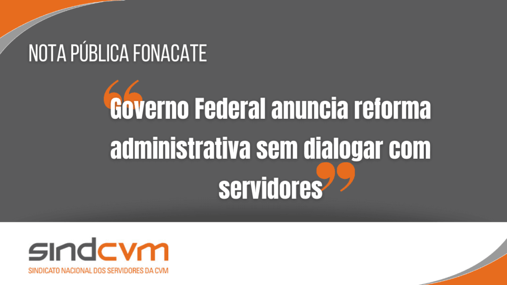 O SindCVM alerta aos servidores da CVM que este é o momento de união no esforço de manter nossas carreiras como típicas de Estado. Está prevista para hoje, a entrega ao Congresso, de um plano elaborado pelo governo que não foi discutido com os servidores, seus representantes e sociedade civil. A nota do Fonacate (Fórum Nacional Permanente de Carreiras Típicas de Estado), assinada por nós, expressa nosso receio em relação a essa proposta.