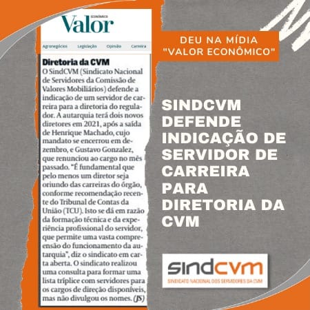 Deu no “Valor Econômico”! A Carta Aberta publicada pelo SindCVM que reivindica o critério de indicação de servidor de carreira da CVM para compor a diretoria da autarquia foi tema de nota publicada no jornal “Valor Econômico” no dia 07 de abril. A íntegra da carta está aqui no site.
